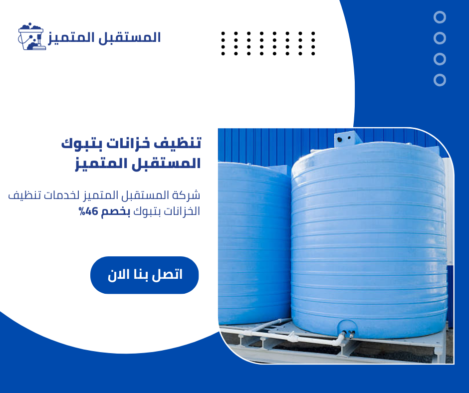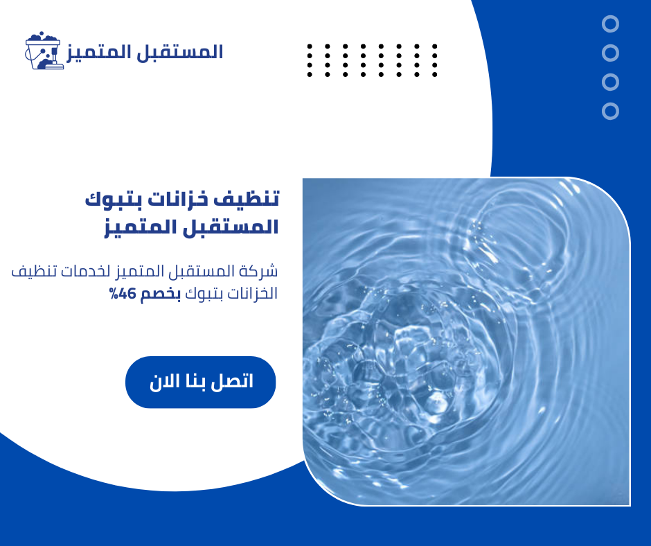 هل تبحث عن أفضل شركة تنظيف خزانات بتبوك؟ لا داعي للمزيد من البحث، فشركة المستقبل المتميز هي الخيار الأمثل لك. نحن نفخر بتقديم خدمات تنظيف خزانات عالية الجودة وفعالة لعملائنا في تبوك، مع التركيز على توفير بيئة صحية ونقية لك ولعائلتك. تتميز شركتنا بالمهنية والخبرة الواسعة في مجال تنظيف الخزانات، حيث نستخدم أحدث التقنيات والمعدات لضمان تنظيف شامل وفعّال للخزانات. سواء كنت بحاجة إلى إزالة الطحالب، أو تنظيف الرواسب، أو تعقيم الخزانات بشكل كامل، فإننا نقدم حلولاً مخصصة تلبي احتياجاتك بشكل فعال وموثوق. نحن نولي أهمية كبيرة لسلامتك وسلامة عائلتك وصحتهم، ولذلك فإن خدماتنا تشمل أيضًا عمليات التعقيم باستخدام مواد آمنة وفعالة. كما نلتزم بالمواعيد المحددة ونضمن رضاك التام عن خدماتنا. اتصل بنا اليوم للحصول على أفضل خدمات تنظيف خزانات بتبوك، واستمتع بمياه نقية وصحية لك ولعائلتك. فنحن هنا لخدمتك وتلبية احتياجاتك بكل احترافية وجودة عالية.